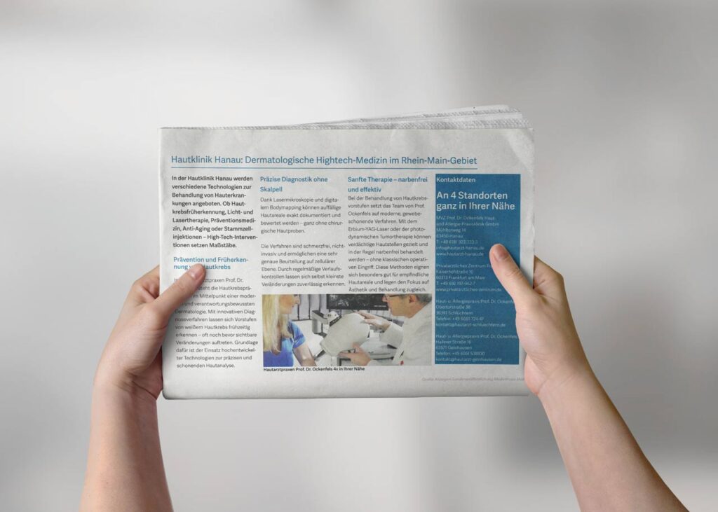 In der aktuellen Sonderveröffentlichung „Kliniken & Fachärzte 2025“ des Main-Echo wird die Hautklinik Hanau als herausragendes Beispiel für moderne dermatologische Hightech-Medizin im Rhein-Main-Gebiet vorgestellt. Im Fokus stehen innovative Verfahren zur Früherkennung von Hautkrebs, der Einsatz von Lasertechnologie, digitales Bodymapping sowie narbenfreie Therapien mit dem Erbium-YAG-Laser. Auch die Themen Präventionsmedizin, Anti-Aging-Behandlungen und schonende Diagnostik ohne Skalpell […]
